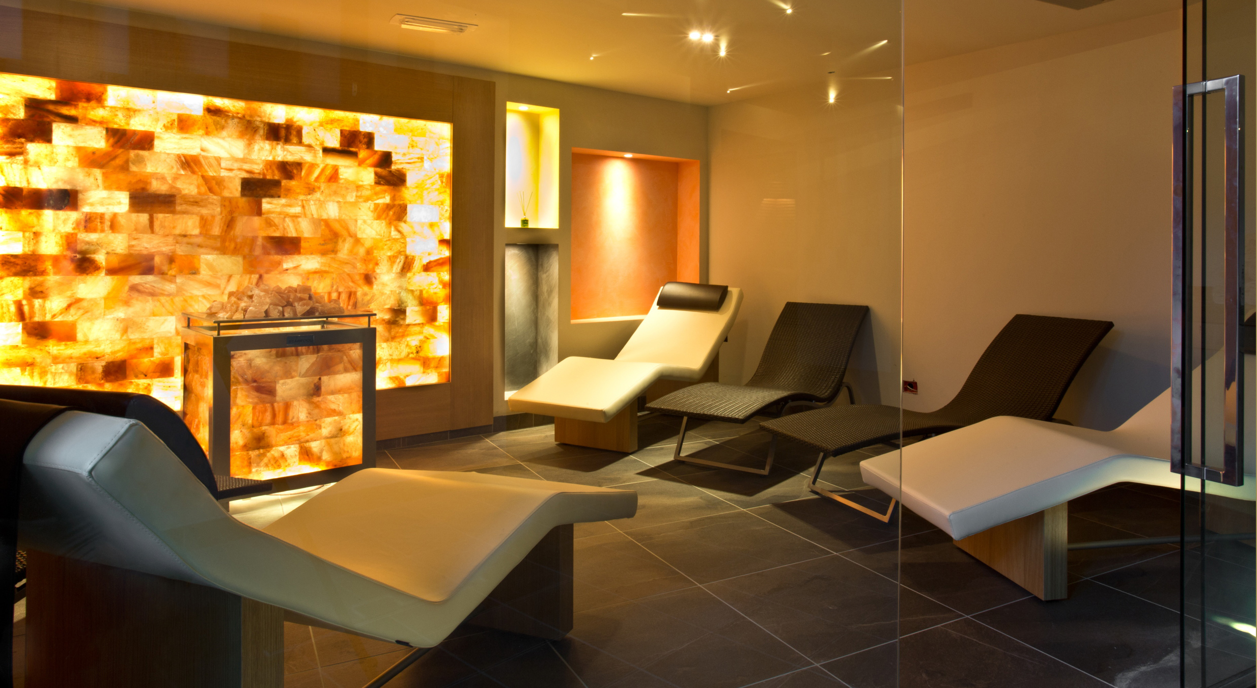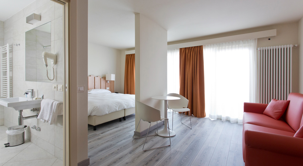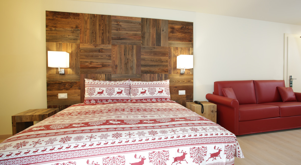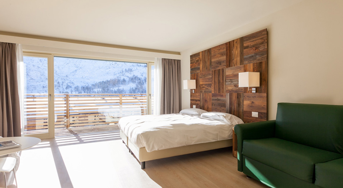 - Pokoje urządzone w stylu góralskim, wyposażone w telewizor, Wi‑Fi oraz często balkon; niektóre apartamenty (suite) mają własne sauny, jacuzzi i kominki, szczególnie modele Presanella czy Adamello.